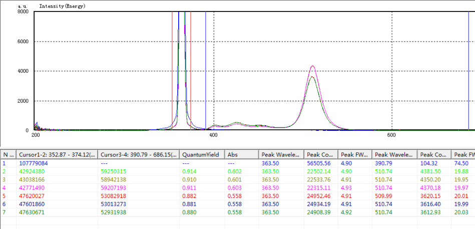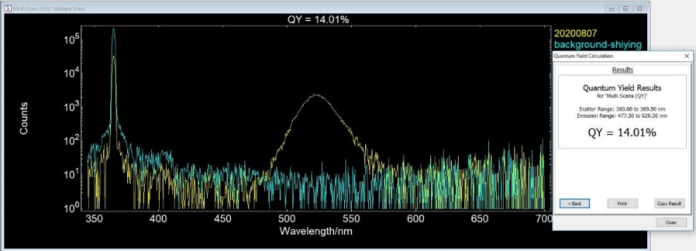 爱丁堡和滨松的设备都可以用来测试量子产率。图6、图7分别展示了爱丁堡和滨松仪器产率计算时的界面,两者界面不太一样。