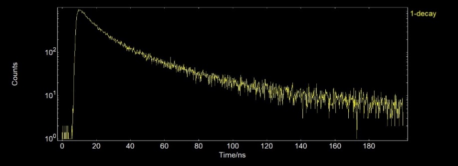 荧光寿命本质上测试的是样品的某波长发射的时间衰减曲线,也叫做时间分辨衰减谱。和测稳态谱的主要区别是,寿命测试要选择合适的脉冲光源,调整好合适的脉冲频率。利用一定波长的脉冲光激发样品,然后监测某个波长的发射强度在不同时间通道累积下来的光子数,纵坐标为荧光强度(光子计数),横坐标为时间(t),其记录的是具体某一波长的荧光强度随时间的变化。