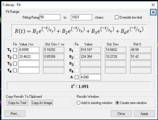 平均寿命τave可通过τ值和B值代入图11中的公式计算获得。平均寿命τave的两种表达式本质上是相同的,因为Rel%本身就是τ值和B值的函数,实际应用中第二个式子更为简化、计算更方便。图10中χ2表示置信因子,当0.8<χ2 <1.3时,表示拟合结果可靠适用。工程师一般用爱丁堡仪器自带的软件给出相应合适阶数的拟合,该拟合结果仅供参考。结合自身样品,如需其它阶数的结果,可用origin快速拟合。