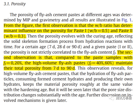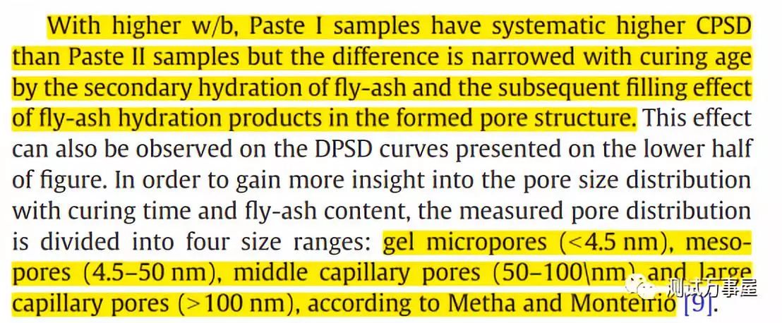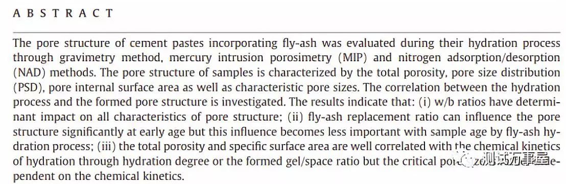 这篇文章探究了掺有粉煤灰的水泥净浆在水化过程中孔结构的变化。作者使用多种测试手段对样品的孔隙率、孔径分布、比表面积进行表征。