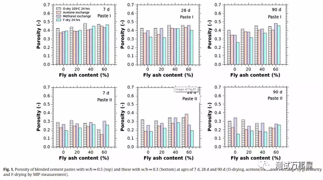 结果显示,w/b=0.5的样品的孔隙率明显高于w/b=0.3的样品,表明水胶比对孔隙率有决定性影响。另一方面,与ff=0和20%的样品相比,ff=40%和60%的样品的孔隙率在7-90d基本保持不变,这是因为对于大体积粉煤灰水泥浆体,粉煤灰颗粒的水化作用消耗形成的水泥水化产物并产生其自身的水化产物,使材料的孔隙率与硬化龄期大致保持一致。在干燥方式的讨论中,作者发现w/b=0.5时,使用O-drying干燥的样品的孔隙率为最大。