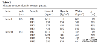 作者设置了8组试验,水胶比w/b分别为0.3和0.5,每个水胶比中,粉煤灰掺量为0%、20%、40%和60%,养护时间分别为7天,28天和90天。具体配比见表2。