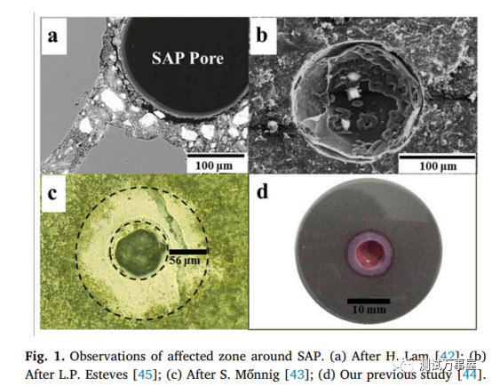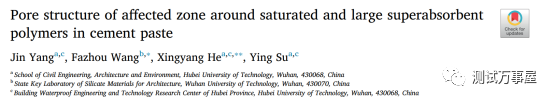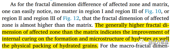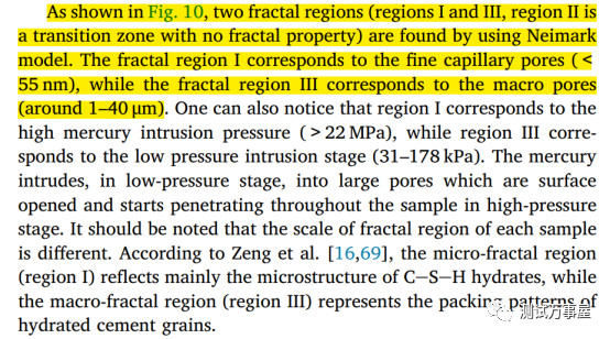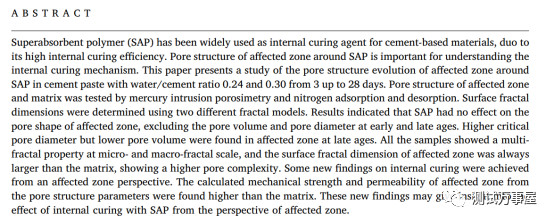 文章探究了Superabsorbent polymer (SAP)与水泥净浆之间的接触区域的孔结构。作者设置了水灰比为0.24和0.3的试验,使用MIP试验和Neimark model计算了二者接触区域内的分形维数。