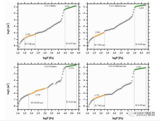 在压力大于22MPa的时候,孔的直径小于50nm,这个阶段具备分形特征;压力为31-178kPa范围内,孔径为1-40,这个阶段具备分形特征。