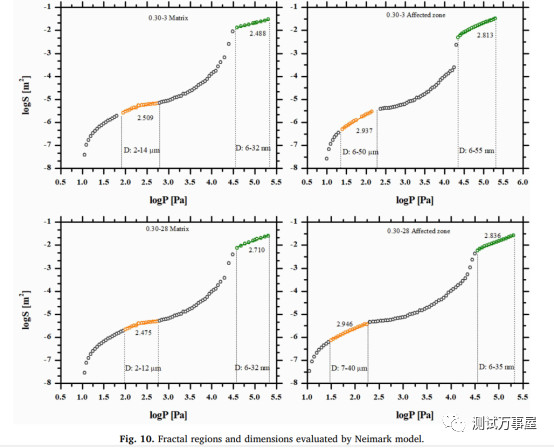 使用Neimark model步骤:(1)根据压汞数据和公式4、6计算出固液接触面积S,其中,Vp表示压力P下的压汞量;(2)使用公式7分别计算logS和logP;(3)以logP为x轴,logS为y轴拟合,得到直线斜率D-2,D表示分形维数。 图10为依据MIP数据和Neimark model计算得到的水灰比分别为0.24和0.3的水泥浆体和与SAP接触区域的孔的分形维数。图上显示,每个样品的分形维数均可分为3段,这说明水泥的孔结构呈分段分形特征。