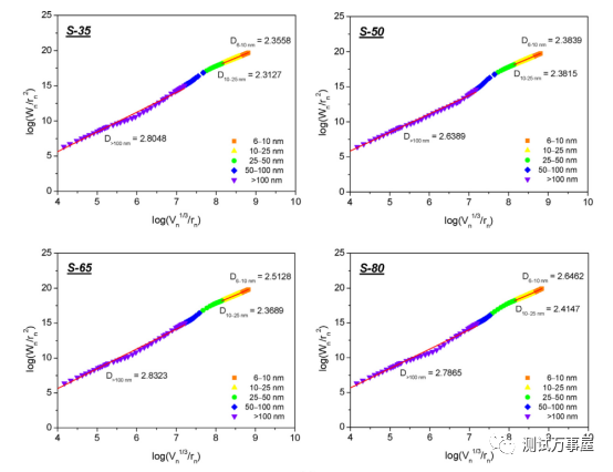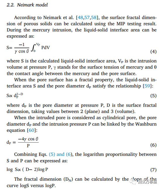 使用Neimark model步骤:(1)根据压汞数据计算,其中,Vi表示压力Pi下的压汞量,n为总数据量;(2)计算,其中Vn表示第n步的累计吸附量,rn表示第n步的孔径;(3)以为x轴,拟合,得到直线斜率D,D表示分形维数。