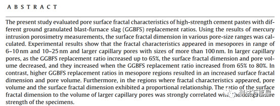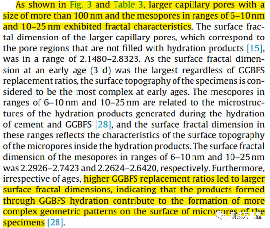 文章探究了不同掺量的高炉矿渣(GGBFS)对水泥孔结构分形特征的影响。作者使用压汞测定样品的孔结构,试验结果表明,孔径为6-10nm,10-25nm和大于100nm的孔出现分形特征。在较大的毛细孔中,随着GGBFS替代率增加到65%,孔表面分形维数和孔体积减小,并且当GGBFS替代率从65%增加到80%时,表面分形维数和孔体积增加。在中孔中,GGBFS替换率提高后,孔的表面分形维数和孔体积增大。