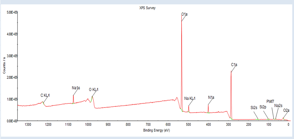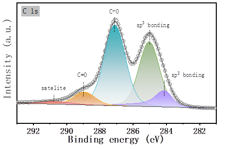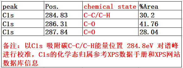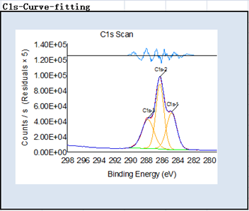 2. 通过XPS数据处理软件Avantage 对C1s精细谱进行分峰拟合,根据C1s的峰型和能量位置可以把C1s分成四种化学态:结合能在283.5-284.0eV附近的C1s 主要归属为无机碳;吸附碳和有机碳C-C/C-H 结合能通常在 285eV附近;C-O/C-N 化学键的结合能通常在285.8~287 eV之间;而C=O化学键的结合能通常在287.5~288.5eV之间;通过分峰拟合得到不同化学态以及不同化学态的原子百分含量(如结果展示中定量数据所示)。