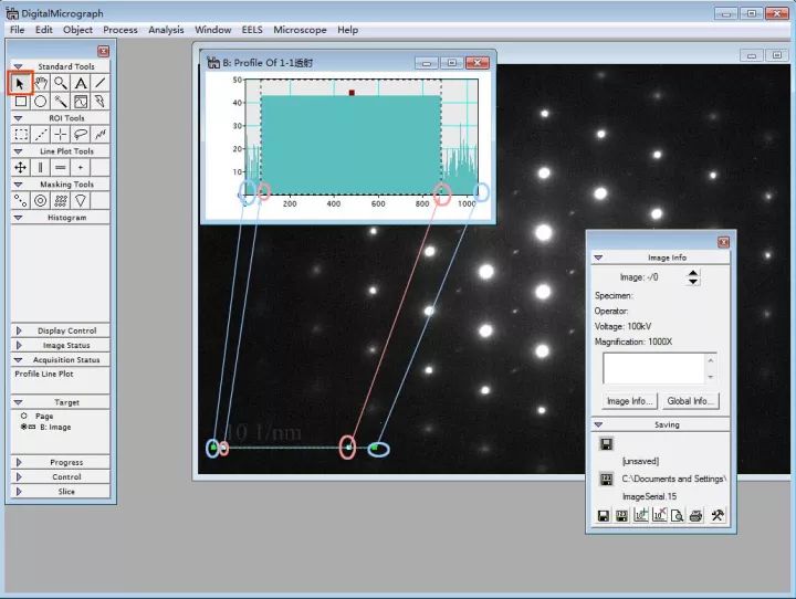 然后在profile of 对话框中点击左键不要松,拖动可选择沿图像中已知线条(图中蓝色线条包围区域)任意长度距离的线条(图中红色箭头包围区域)。在线条的中间显示出所选区域所占长度单位。再测量出标尺长度。图中为810单位长度,即在图像中810单位长度代表实际的10 nm-1 。也就是说81单位长度代表1 nm-1 。