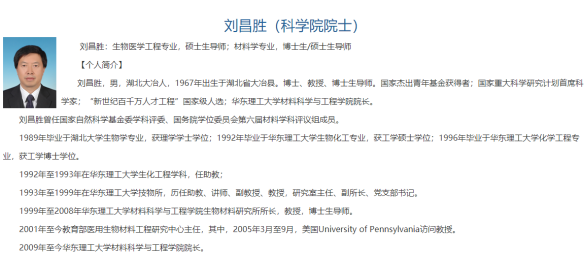 刘昌胜,男,国家杰出青年基金获得者;国家重大科学研究计划首席科学家;“新世纪百千万人才工程”国家级人选;华东理工大学材料科学与工程学院院长。先后承担了国家“863”项目、国家自然科学基金重点及面上项目、国家重大科学研究计划项目等,将化学反应工程的原理和方法用于人体组织修复材料的可控制备及相关机理研究,开发出一种新型硬组织修复材料——自固化磷酸钙人工骨产品,并于2000年获得国家食品药品监督管理局的准生产注册证。该材料实现了形状任意可塑、人体内自行硬化和好的生物相容性的统一,并在体内诱导新骨形成,解决了长期以来困扰骨科医生和病人的骨缺损修复材料问题。为了进一步提高材料的成骨活性,适应大段骨缺损及再生能力弱的病人的治疗要求,他采用基因工程技术,在原核生物中成功表达出骨形态发生蛋白-2(rhBMP-2),一种促进成骨的活性生长因子。创新性地提出利用材料与生长因子的相互作用提高生长因子骨诱导活性的新思路,通过类肝素磺化壳聚糖等,能有效提高rhBMP-2诱导成骨分化的能力,并研究了其机理。刘昌胜院士兼具材料、生物和化工的学术背景,主要从事生物材料的研究,包括组织修复与再生材料、纳米生物材料、可注射生物材料、药物/生物活性因子控释等。