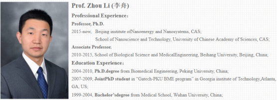 李舟研究员,博导,国家杰青,中科院北京纳米能源与系统研究所研究室主任,现任中国生物医学工程学会青委会副主任委员、中国生物工程学会青委会委员、中国生命电子学会青年副主任委员,纳米能源所生物与环境平台主任,中国科学院大学纳米科学与技术学院纳米能源教研室主任。担任Nano Select副主编(Wiley), Smart Materials in Medicine副主编(KeAi),Science Bulletin编委、《生命科学仪器》编委、Sensors and Actuators Report的编委、Advanced Functional Materials,InfoMat, Materials等杂志的Guest Editor-in-Chief,腾讯基金会“科学探索奖”提名人和CFDA创新医疗器械特别评审专家等,同时担任70多个国际期刊的邀请审稿人。其研究重点是生物电子学、自力医疗系统、纳米发电机、植入式能量收集装置、单细胞机械和纳米生物传感器,目前已发表在Sci. Adv., Nature Comm., Adv. Mater., Adv. Energy Mater., Nano Lett., Adv. Funct.Mater., ACS Nano, Nano Energy, Ann. Rev. of Biomed. Engin., Adv. Sci., Small, Research,Adv. Health. Mater. and Sci. Bull.等期刊总计160余篇。