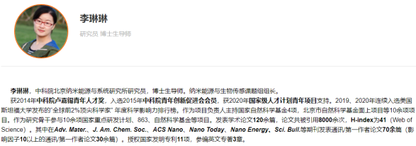 李琳琳,中科院北京纳米能源与系统研究所研究员,博士生导师。纳米能源与生物传感课题组组长。获2014年中科院卢嘉锡青年人才奖,入选2015年中科院青年创新促进会会员,获2020年国家级人才计划青年项目支持。2019、2020年连续入选美国斯坦福大学发布的“全球前2%顶尖科学家” 年度科学影响力排行榜。作为项目负责人主持国家自然科学基金4项,北京市自然科学基金面上项目等10余项项目。作为研究骨干参与10余项国家重点研发计划、863、自然科学基金等项目。发表学术论文120余篇,论文共被引用8000余次,H-index为41(Web of Science)。其中在Adv. Mater.、J. Am. Chem. Soc.、ACS Nano、Nano Today、Nano Energy、Sci. Bull.等期刊发表通讯/第一作者论文70余篇(影响因子10以上的通讯/第一作者论文30余篇)。授权国家发明专利11项,参编英文专著3章。课题组以“生物材料与器件的研发”为核心,设计电活性生物材料和自驱动器件用于生物医学领域,并设计开发智能纳米药物以提高恶性肿瘤等疾病治疗的疗效。