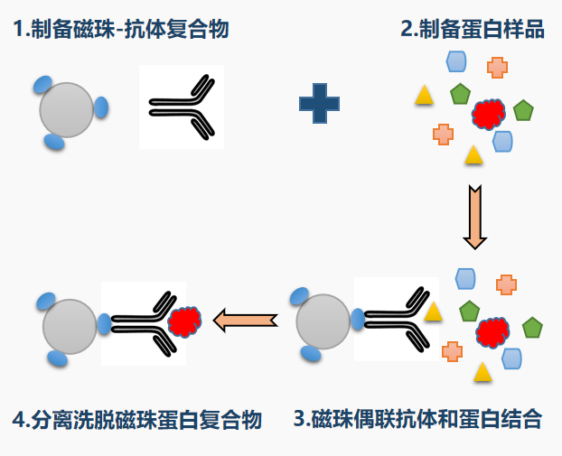 免疫沉淀(IP)是利用固定在磁珠或琼脂糖树脂等固相支持物上,以抗体和抗原之间的专一性作用为基础的用于研究两种蛋白质在完整细胞内生理性相互作用的有效方法;需要从细胞或组织裂解物中分离用于免疫印迹检测或其他检测技术的蛋白和其他生物分子相互作用时,这种方法常用于测定两种目标蛋白质是否在体内结合,也可用于确定一种特定蛋白质的新的作用搭档,已成为研究蛋白质相互作用的经典方法。